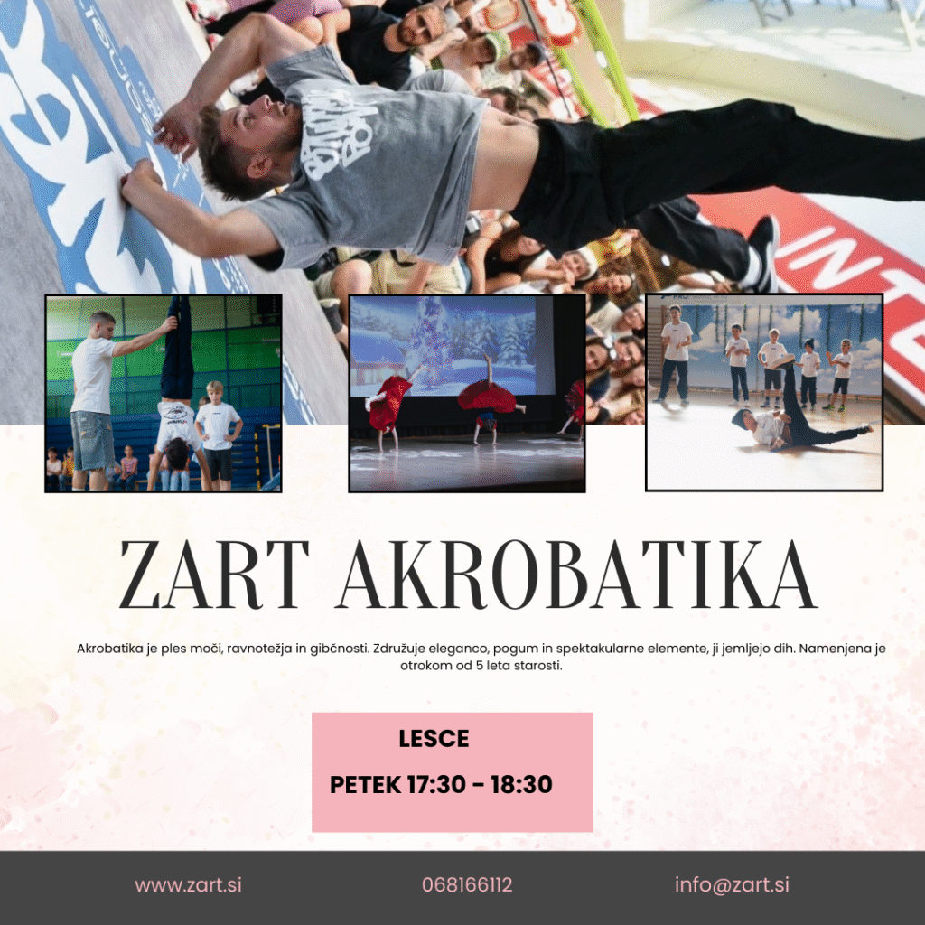Akrobatika z gimnastiko je delovanje človeških podvigov ravnotežja, gibčnosti in motorične koordinacije. Vadba je sproščena in prilagojena različni starosti in znanju otrok. Razvijamo gibalne sposobnosti s poudarkom na moči, gibljivosti, koordinaciji predvsem pa gibanje in učenje v dobri družbi.